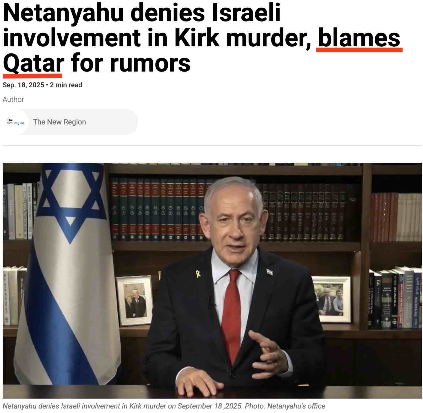 Netanyahu argued that the “insane” rumors, like the accident itself, the Charlie Kirk assassination, and so on, were all Qatar’s fault.
