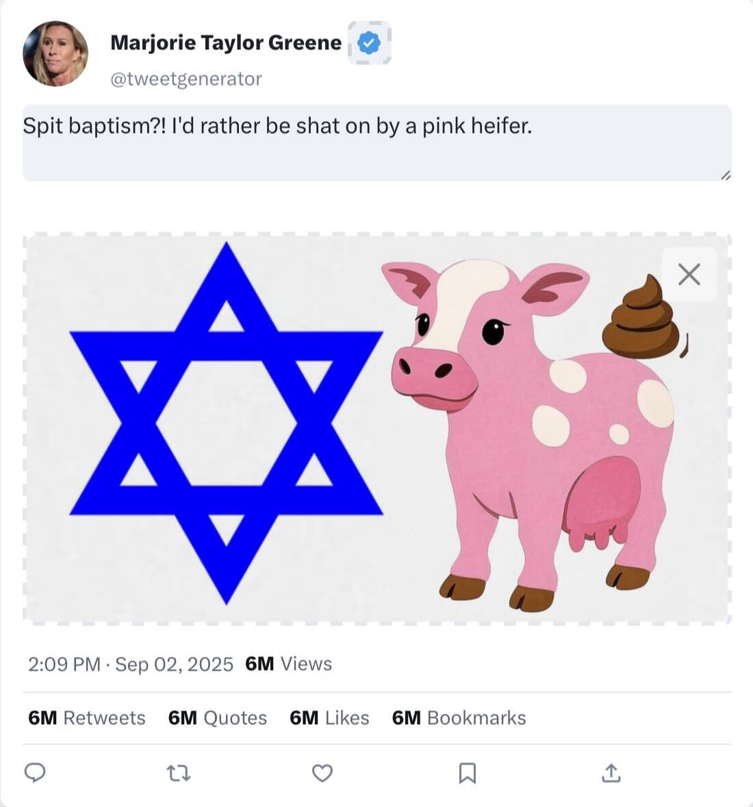 The White House quickly endorsed the new program, as Trump tweeted a promotional film imagining Gaza as a gigantic spit-baptism water park. Congressional leaders of both parties rushed to AIPAC headquarters to sign up for the latest round of bodily-fluid-immersion junkets, though antisemites Marjorie Taylor Greene and Thomas Massie demurred, with Greene tweeting: