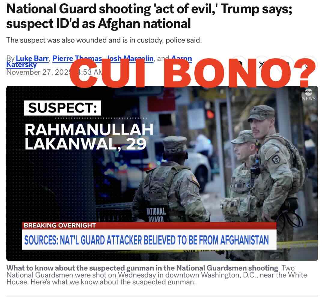 By Kevin Barrett Mainstream media are reporting that an Afghan asylum-seeker, Rahmanullah Lakanwal, shot two National Guard members near the White House on Thanksgiving Eve. The event featured many classic signs of a fabricated false flag event. Here are a few: *CUI BONO? Trump called the attack on “terrorism,” meaning it was a strategically-conceived violent act against civilians (?) designed…